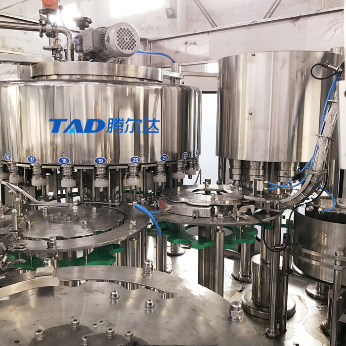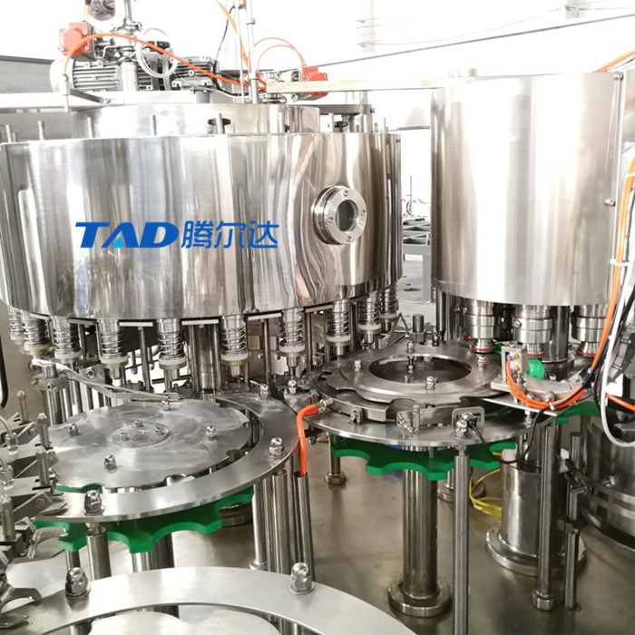 本机主要用于热饮料的冲洗灌装封口作业。本机集无菌水冲洗、高温果汁饮料灌装、旋盖三功能集合在一个机体上,全过程实现PLC控制自动化,适用于聚酯瓶、塑料瓶灌装果汁、矿泉水、纯净水。本机带有温控装置。各部分的适用瓶型调整采用更换拨轮实现(瓶盖一致),轻松自如,简便快捷。灌装方式采用了新型的微压回流灌装,使灌装速度更快更稳定,所以与同规格的机器相比本机的产量更高,效益更大。本机采用了较好的日本三菱可编程控制器(PLC)控制机器的自动运行,进瓶链道采用变风送进瓶,与主机变频器相互配合使进瓶运行更稳定可靠。光电检测各部件的运行状况,所以自动化程度高,操作简便。是饮料生产厂家理想的选择设备。