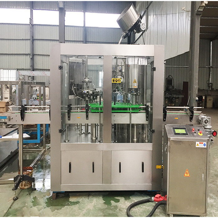 接下来,瓶子旋转回正,限瓶器打开,瓶子被传送到进瓶轮上进入到灌装部分。灌装机上有光电检测传感器,当瓶子通过时,数据会传送到PLC,PLC直接命令机器的启停。从冲瓶系统过来的瓶子经拨瓶星轮拨至灌装系统的托瓶颈装置上,并随回转底座顺时针旋转,瓶托沿凸轮导轨上升将空瓶托起,在托瓶颈装置里的弹簧力作用下瓶口与灌装阀阀座封严,然后开始灌装。灌装分为四个过程:开阀进气、进液回气、液满关阀、放气回位。灌装完毕后,实瓶开始下降至起始高度,然后由灌装封口转瓶机构的拨瓶星轮沿弧形导瓶板送至封口机构,进行封盖。